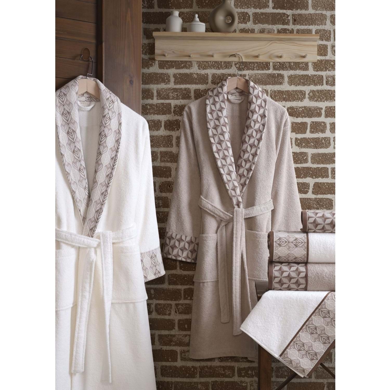Dantela 6'lı Jakarlı Pamuk Krem-Kahve Bornoz Seti - Beste 6'lı Jakarlı Pamuk Krem-Kahve Bornoz Seti - Beste