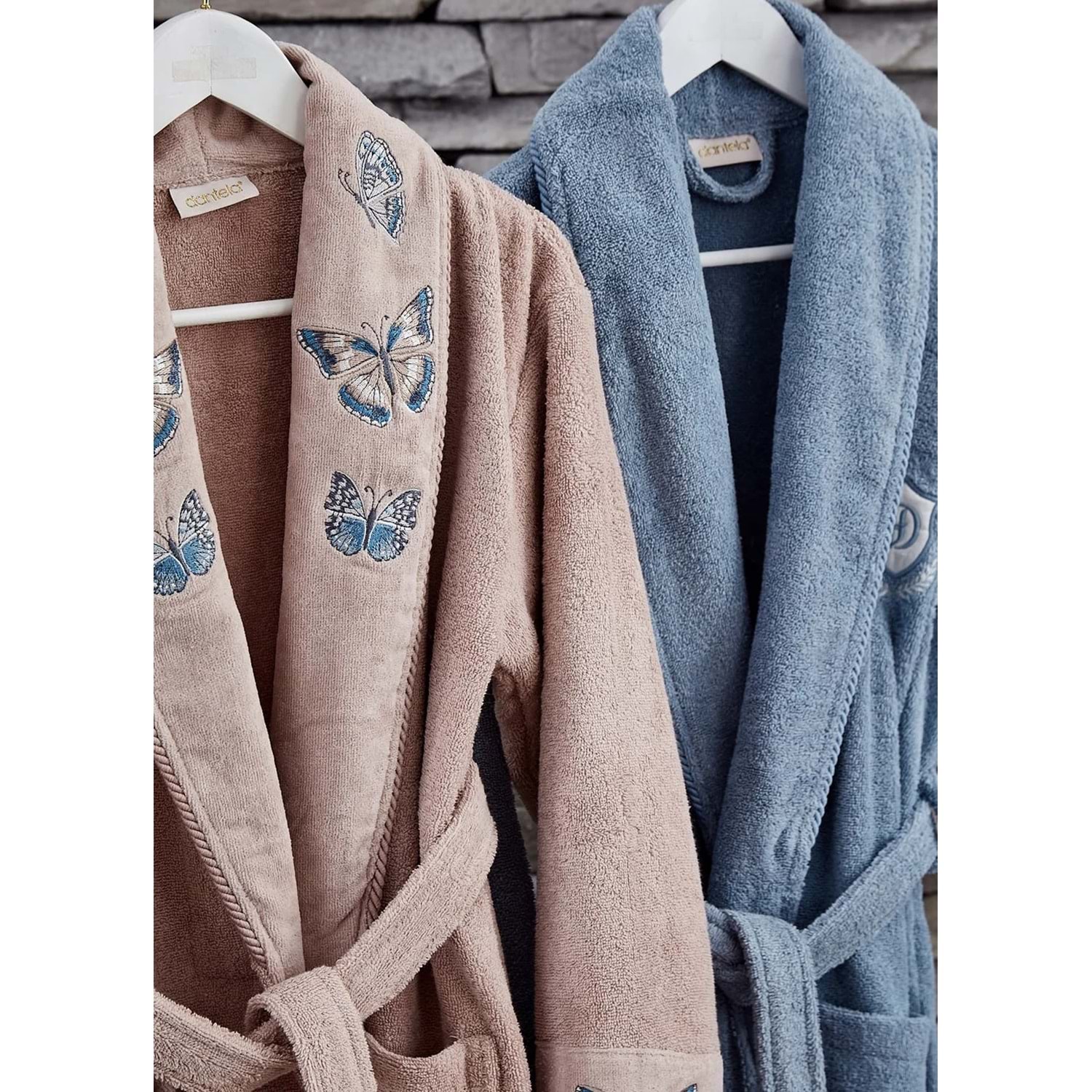 %100 pamuk ipliğinden üretilen ürünümüz ultra soft yapısı ile oldukça yumuşak bir yapıya sahiptir. pamuğun yumuşak yapısı sayesinde rahat bir kullanım sağlamaktadır. Pamuk lifinin yüksek hidrofil yapısı sayesinde hızlı su çekme ve hapsetme özelliğine sahiptir. Yıkama sonrası kumaş yüzeyi sertleşmez. Özel tasarım nakış işlemelidir. Toplam 6 parçadan oluşmaktadır. 1 adet bay bornoz - 1 adet bayan bornoz - 2 adet 50x90cm baş havlusu 2 adet 70x140cm banyo havlusu. Özel tasarım karton kutusu ile gönderilmektedir.
