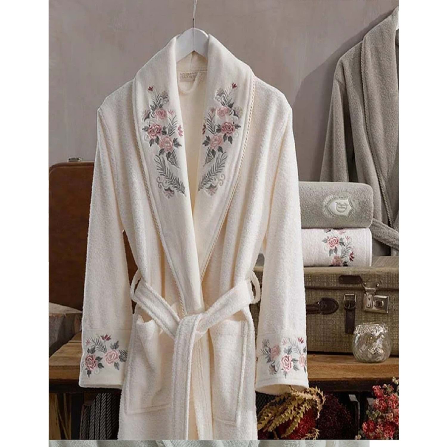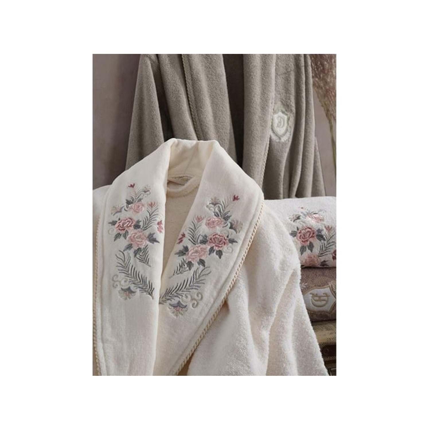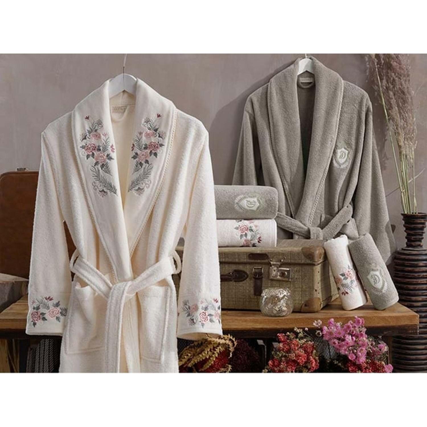 Ürün Özellikleri Ödeme Seçenekleri Dantela markasının krem-bej renkli bu bornoz seti, %100 Türk pamuğu kullanılarak üretilmiştir. Set, 1 adet bay bornoz (L/XL), 1 adet bayan bornoz (S/M), 2 adet baş havlusu (50x90) ve 2 adet banyo havlusu (85x150) içermektedir. Her bir parça, yüksek kaliteli pamuk dokuması ile hem sağlıklı hem de yumuşak bir kullanım sunar. Nakış desenleri ile zenginleştirilen bu set, banyo rutininize zarafet katacak.