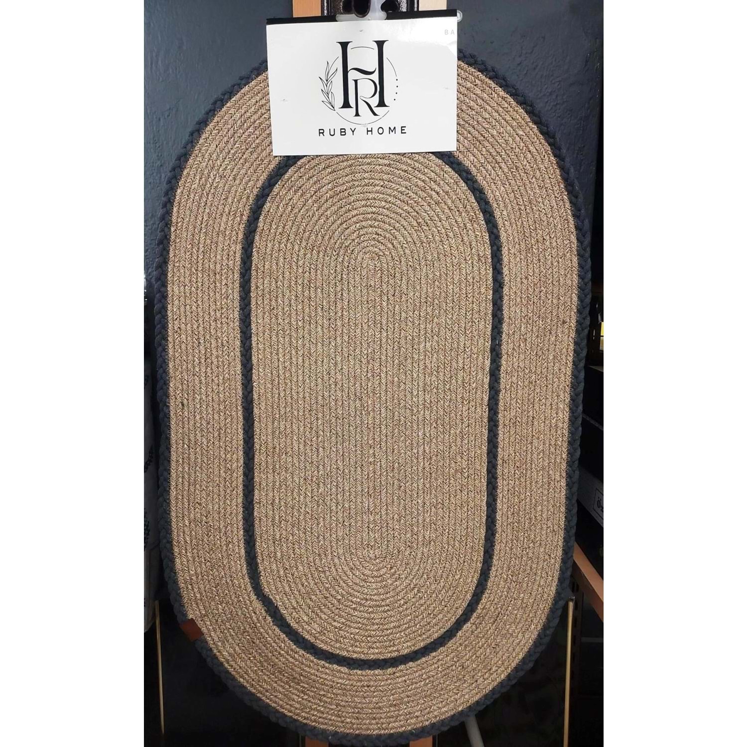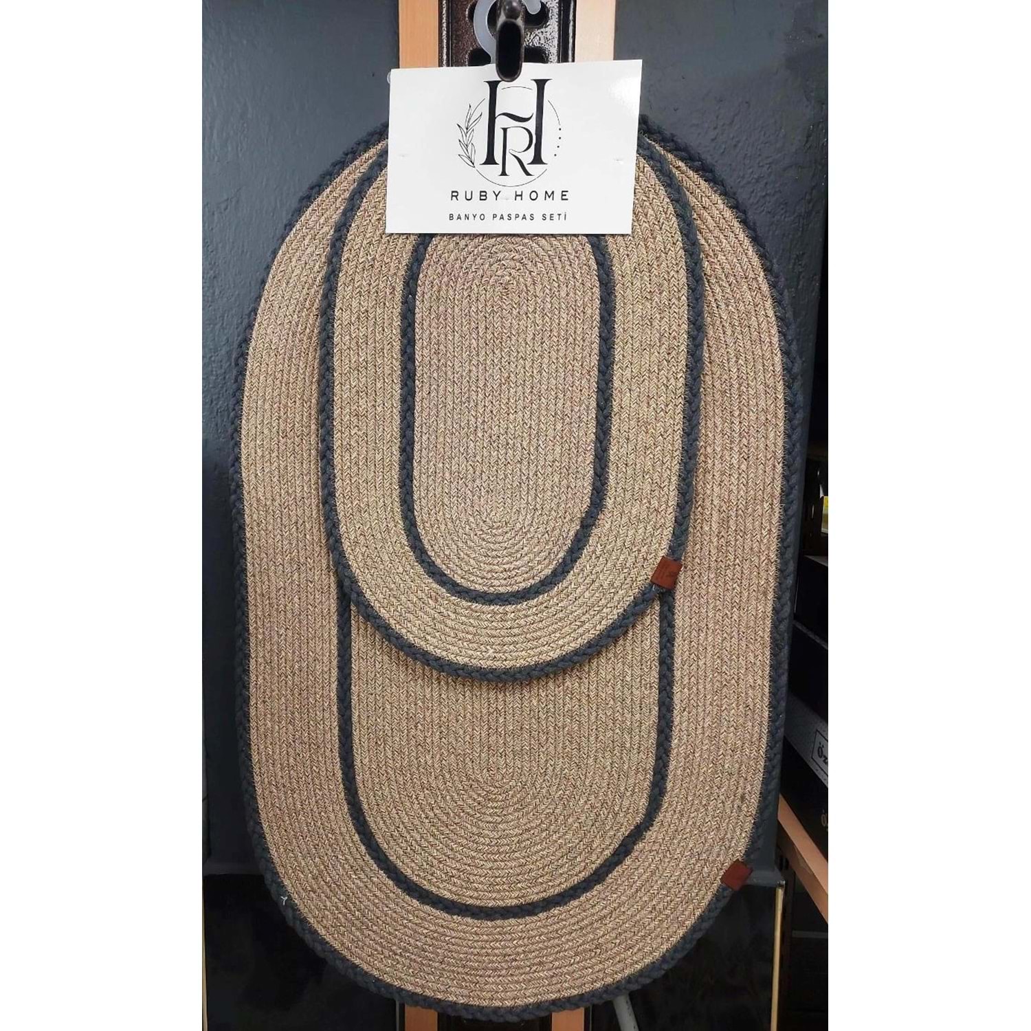 Jüt Hasır 2li Lüks Banyo Seti Paspas Takımı-Bej Kenarı Koyu Gri Örgülü