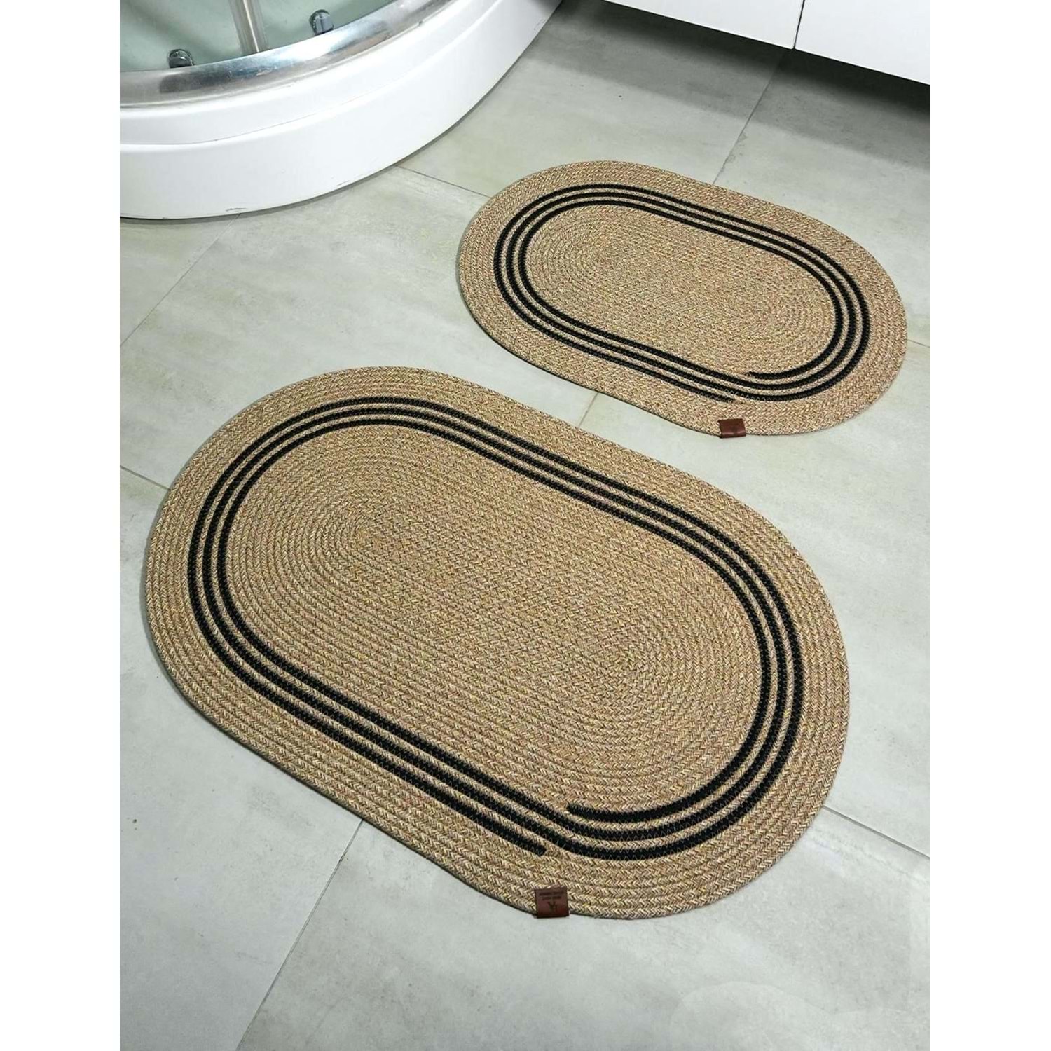 Jüt Hasır 2li Banyo Seti Paspas Takımı-Bej Ortası Aralıklı Siyah