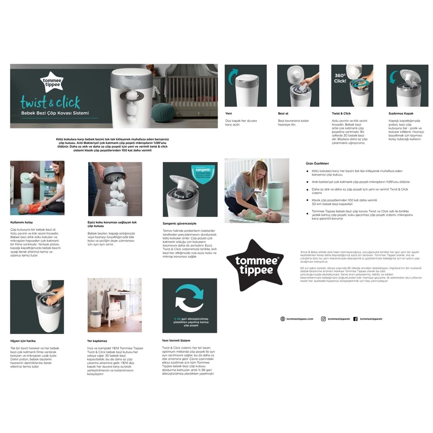 • Kötü kokulara karşı her bezini tek tek kitleyerek muhafaza eden benzersiz çöp kutusu • Anti-bakteriyel çok katmanlı çöp poşeti mikropların %99'unu öldürür. •Daha az atık ve daha az çöp poşeti için yeni ve verimli Twist & Click sistemi klasik çöp poşetlerinden 100 kat daha verimli • 30 kirli bebek bezi kapasiteli