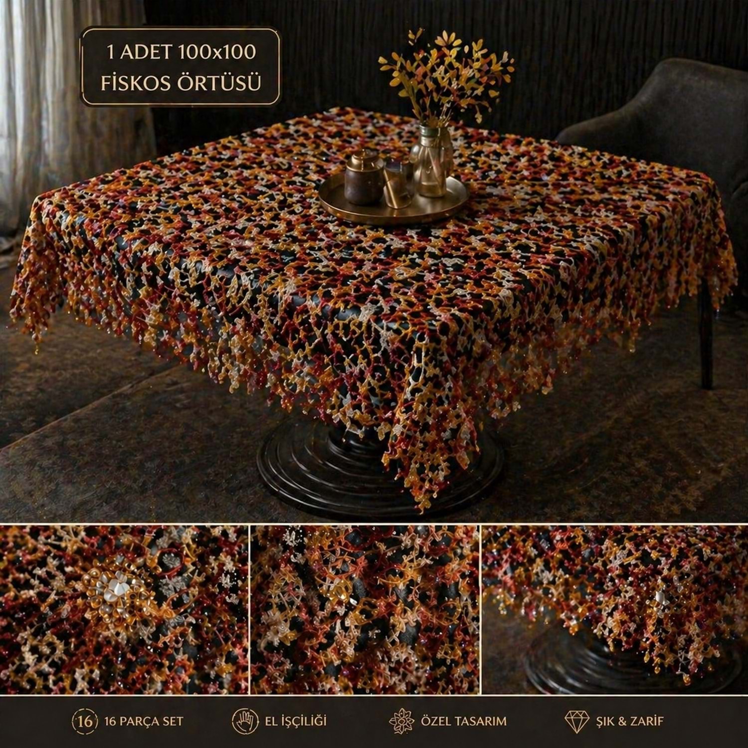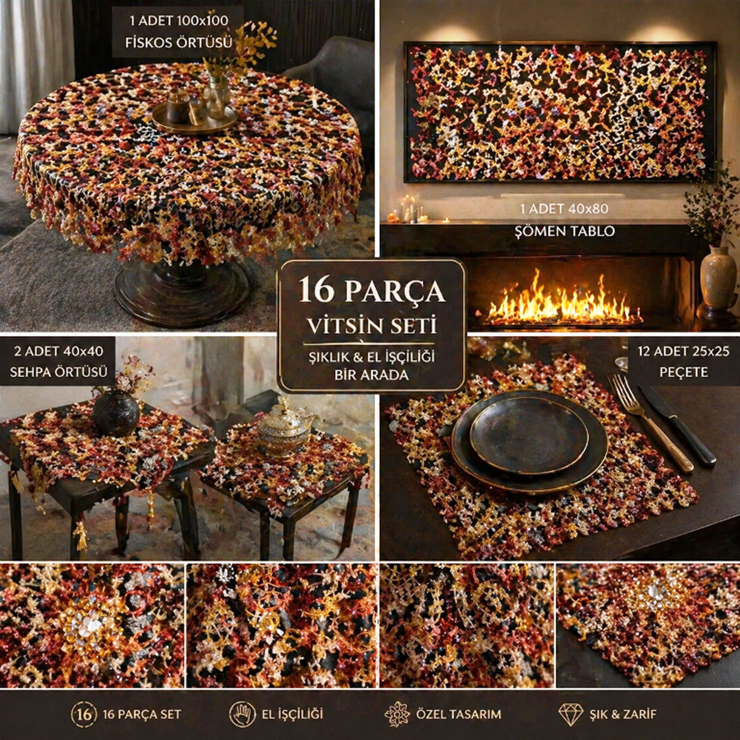 el örme tığ işi vitrin seti ürün özelikleri 16 parça 1 adet fiskos 100*100 cm 1 adet runner 50* 100 cm 2 adet sehpa örtüsü 40*40 cm 12 adet vitrin pecetesi 35*35 cm NOT İSTERSENİZ 1 ADET FİSKOS U KOLTUĞUNUZDA ŞAL OLRAK KULLLANABİLİRSİNİZ