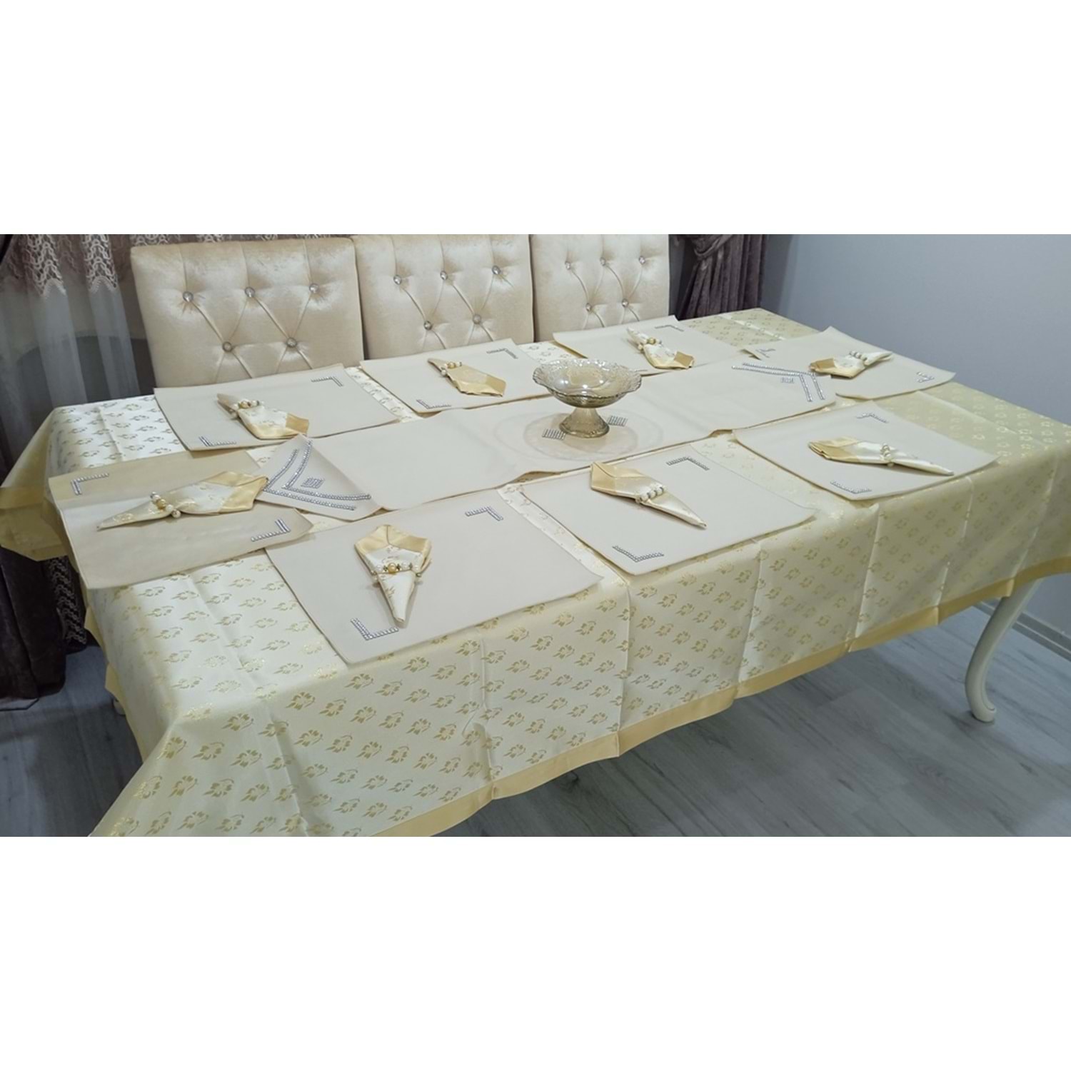 mandaş yemekteyiz yemek seti boncuk işlemeli 26 parça krem 1 adet masa örtüsü dertsiz 160*220 1 adet s deri runner 35*120 cm 8 adet s deri tabak altlığı 8 adet pecete 8 adet yüzük makinada yıkanabilir 40 c ütü istemez kurutma makinasında kurutabilirsiniz ütü yapabilirsiniz