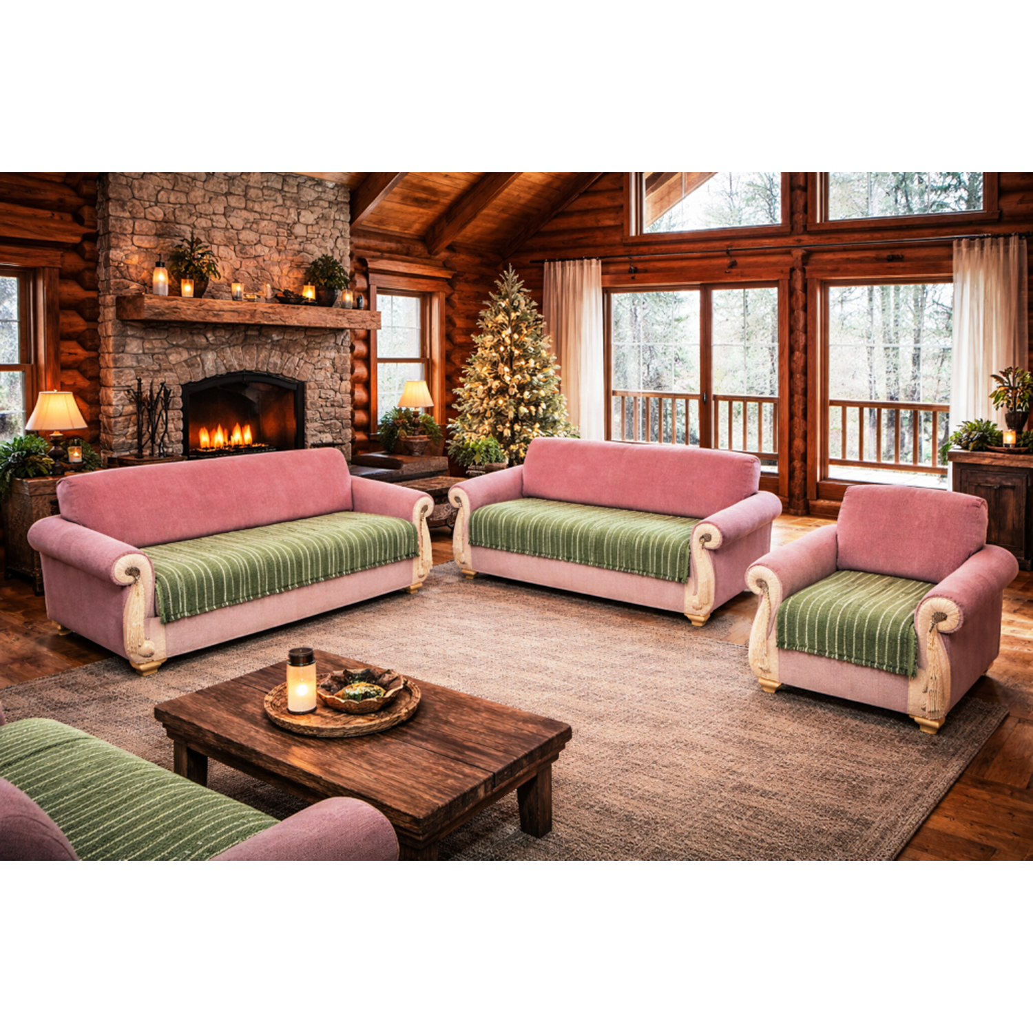 Mandaş Kolsuz Oturma yeri koltuk örtüsü 4 parça krem/ yeşil
