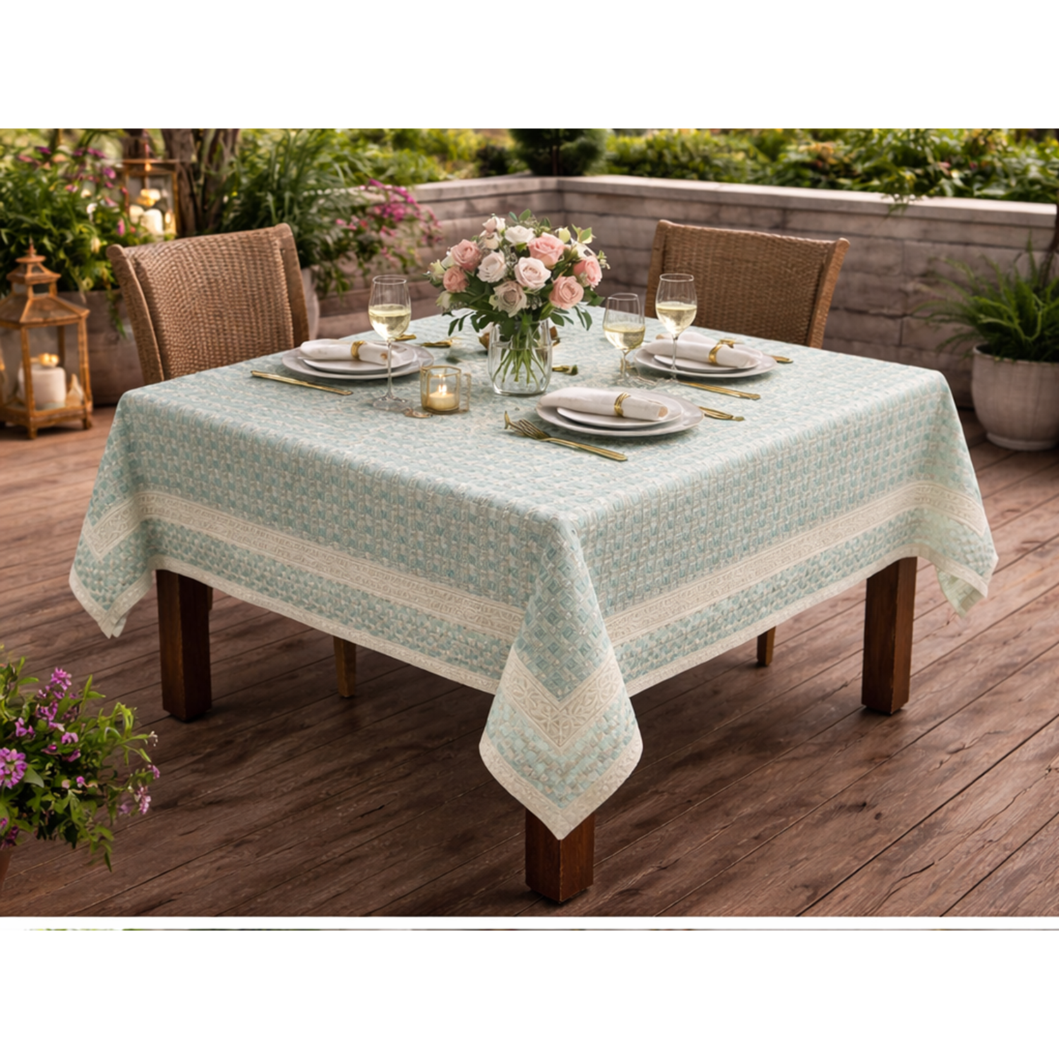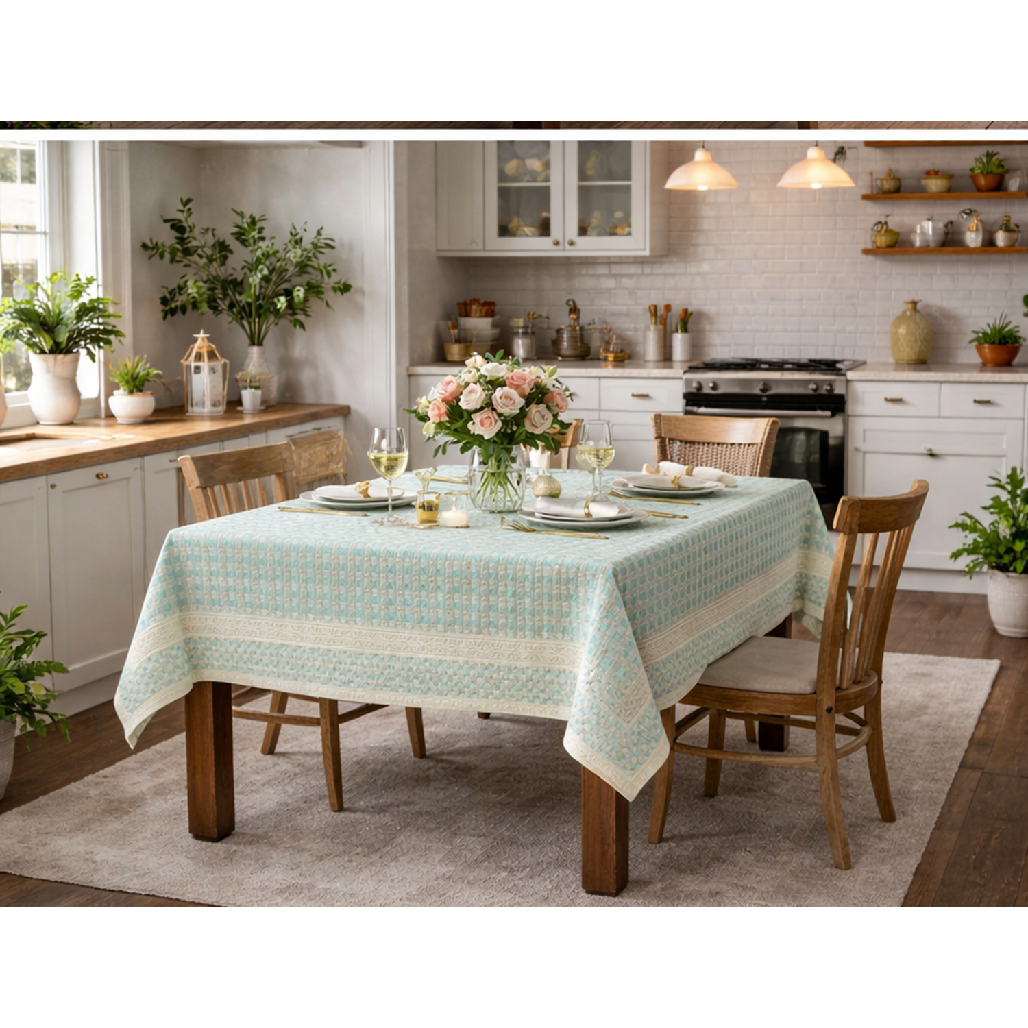 Zarif desenleriyle ve kenar bordür ile süslenmiş, otantik bir görünüm sunan krem/ yeşil rengi masa örtüsü, yemek masanızın şıklığını artırır