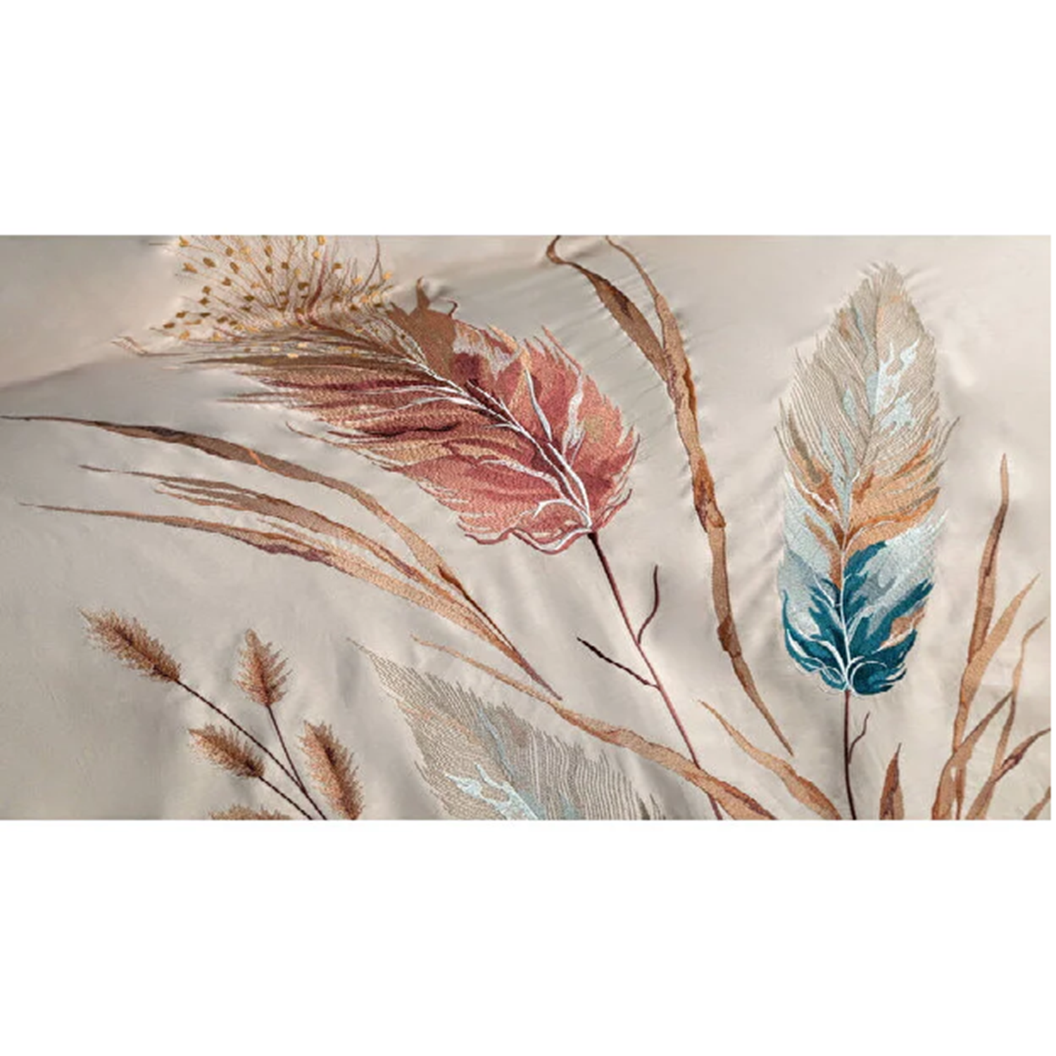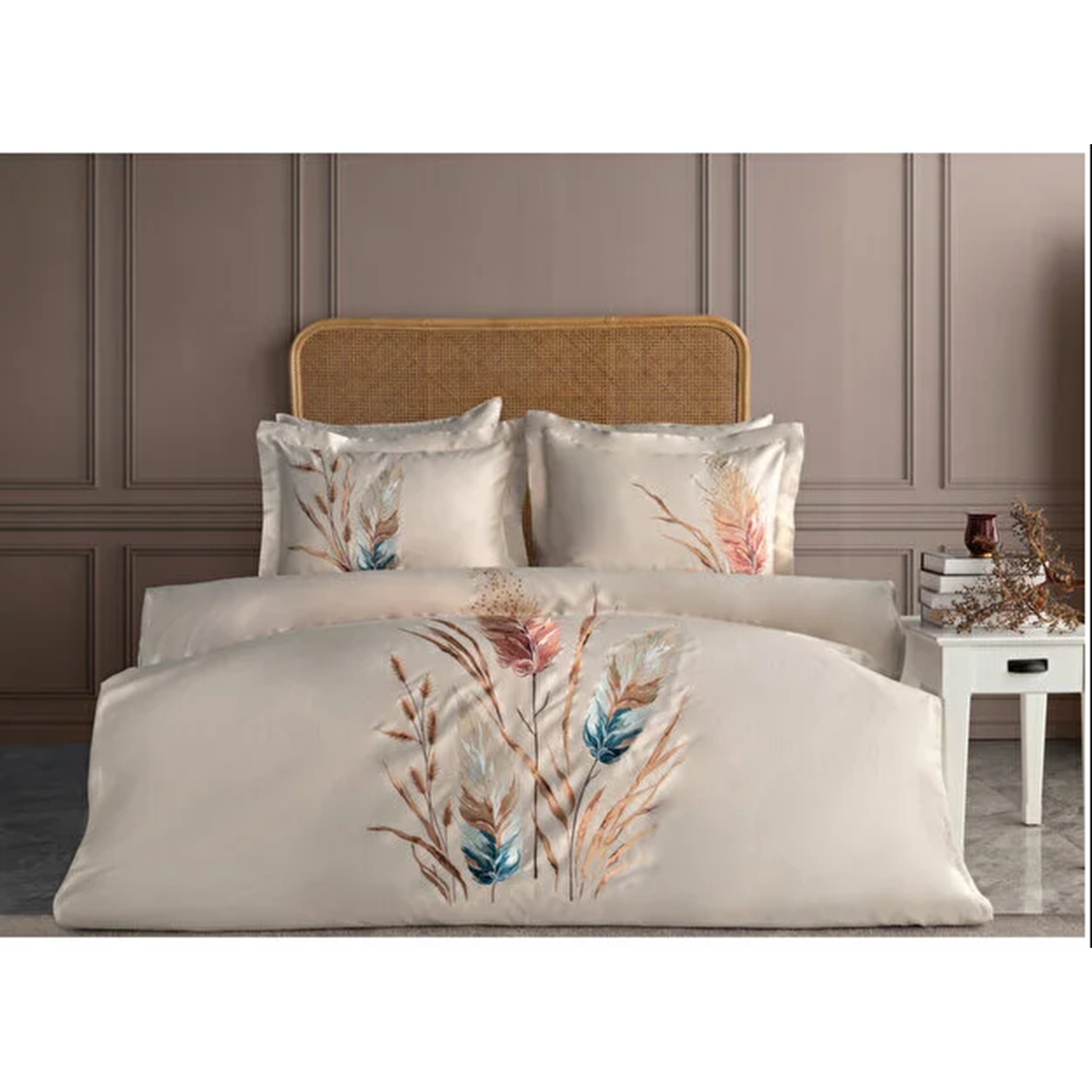 Yatak odanıza doğanın zarif dokunuşunu getirin! Krem zemin üzerine işlenmiş zarif ot ve tüy desenleriyle bezenmiş bu nevresim takımı, şıklığı ve doğallığı bir arada sunuyor. Yumuşak dokusu ve saten kumaşın parlaklığı sayesinde hem estetik hem de konforlu bir uyku deneyimi yaşatır.