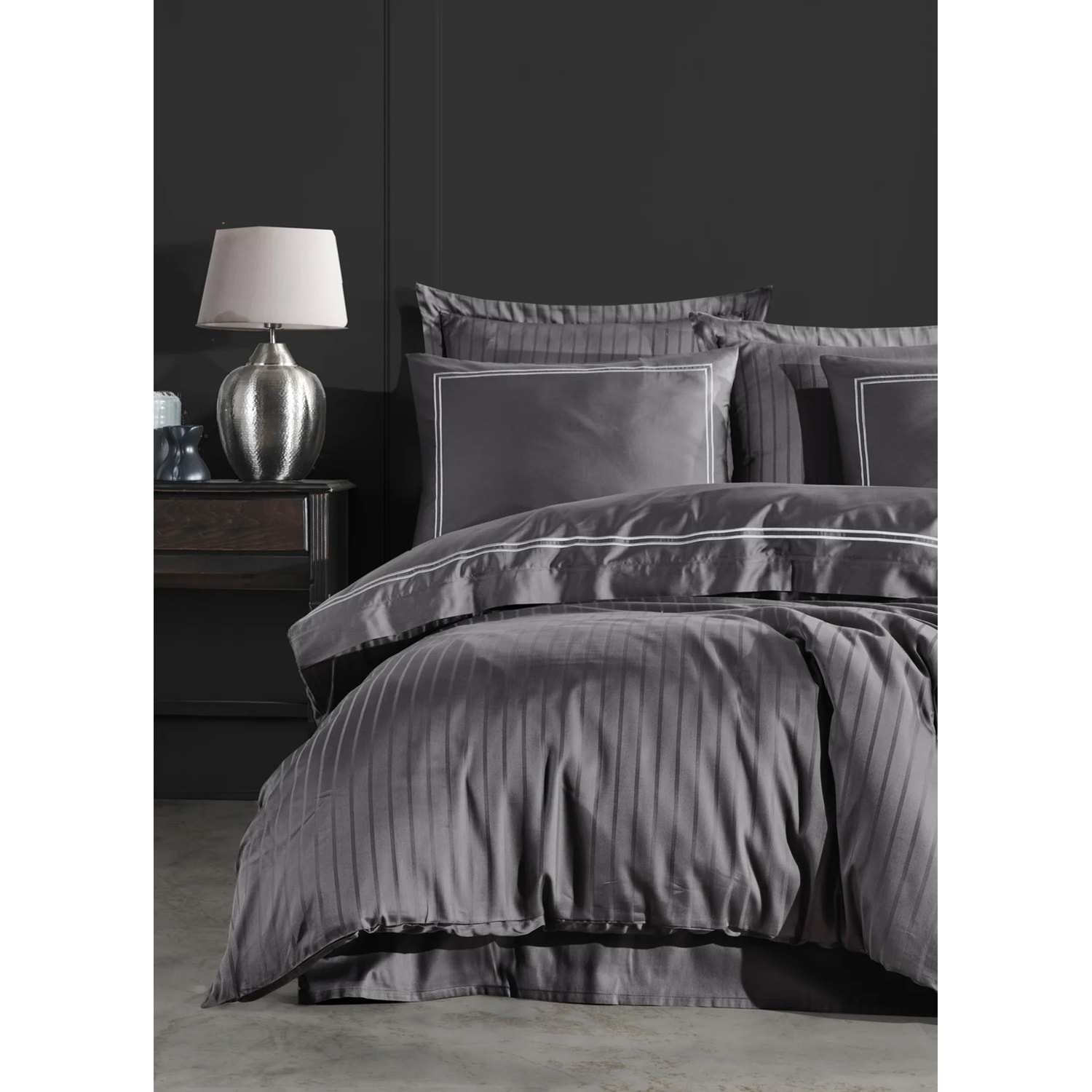 Eşsiz tasarım ve ipeksi dokunuş ile tanışın… Pamuk saten kumaş olarak ürettiğimiz ürünümüz 83 tel iplikten oluşmaktadır. Bir santimetrekare de 83 tel iplik kullanılmıştır. Tamamen %100 pamuk ipliği kullanılarak üretilmiştir. Özel olarak tasarladığımız desenlerimizi nakış işleme tekniği kullanarak kumaşlarımızın yüzeyine işlemekteyiz. Yıkama mukavemeti en yüksek seviyede üretilmiştir. Yıkama sonrası renk solması, kumaş küçülmesi, boncuklanma (pilling) gibi sorunlar yaşanmamaktadır. Çarşaf boyutunu normalde daha geniş üretilerek çarşaf toplanma riskini en minimum seviyede tutmaktayız. Kullanım konforu ve şık bir tasarım sunarak evinizin tarzını yansıtıyoruz. Ürün İçeriği toplam 6 parçadan oluşmaktadır.