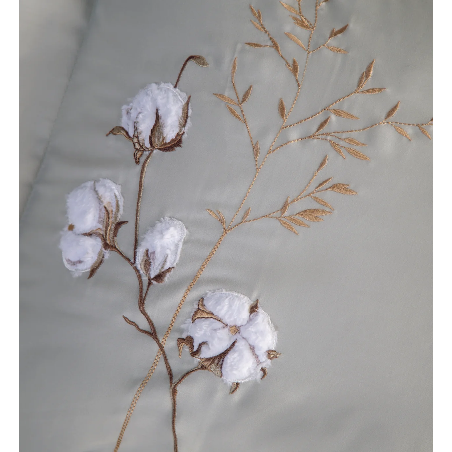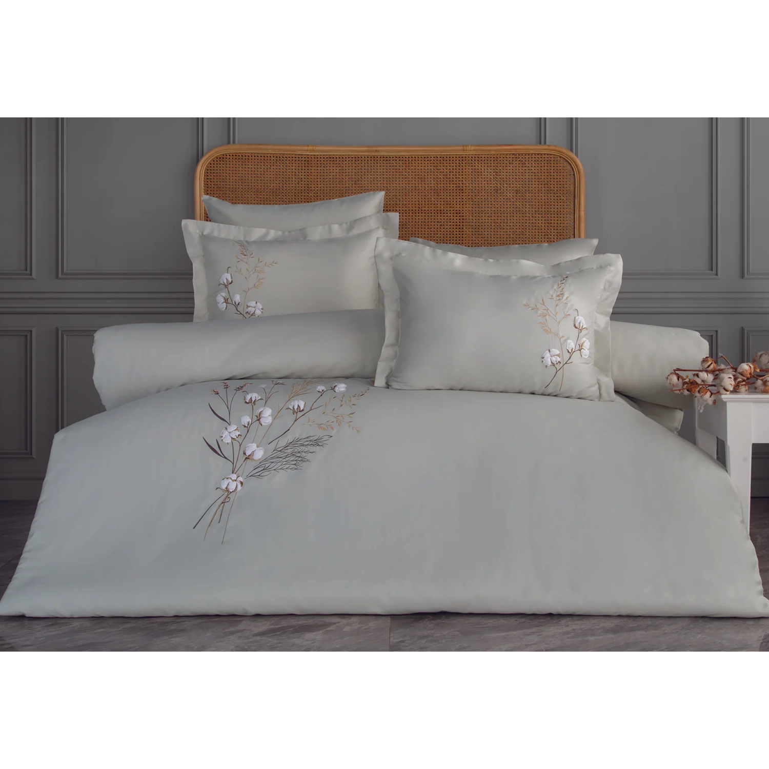 ? Ürün Özellikleri: • Takım İçeriği: 200x220 1 adet nevresim, 240x260 1 adet çarşaf, 60x80 volanlı 2 adet yastık kılıfı, 50x70 düz 2 adet yastk kılıfı • Kumaş: %100 pamuk • Renk: Mint • Şık nakış işlemeli detaylar • Nefes alan ve terletmeyen yapı • Yumuşak tuşeli, uzun ömürlü kullanım