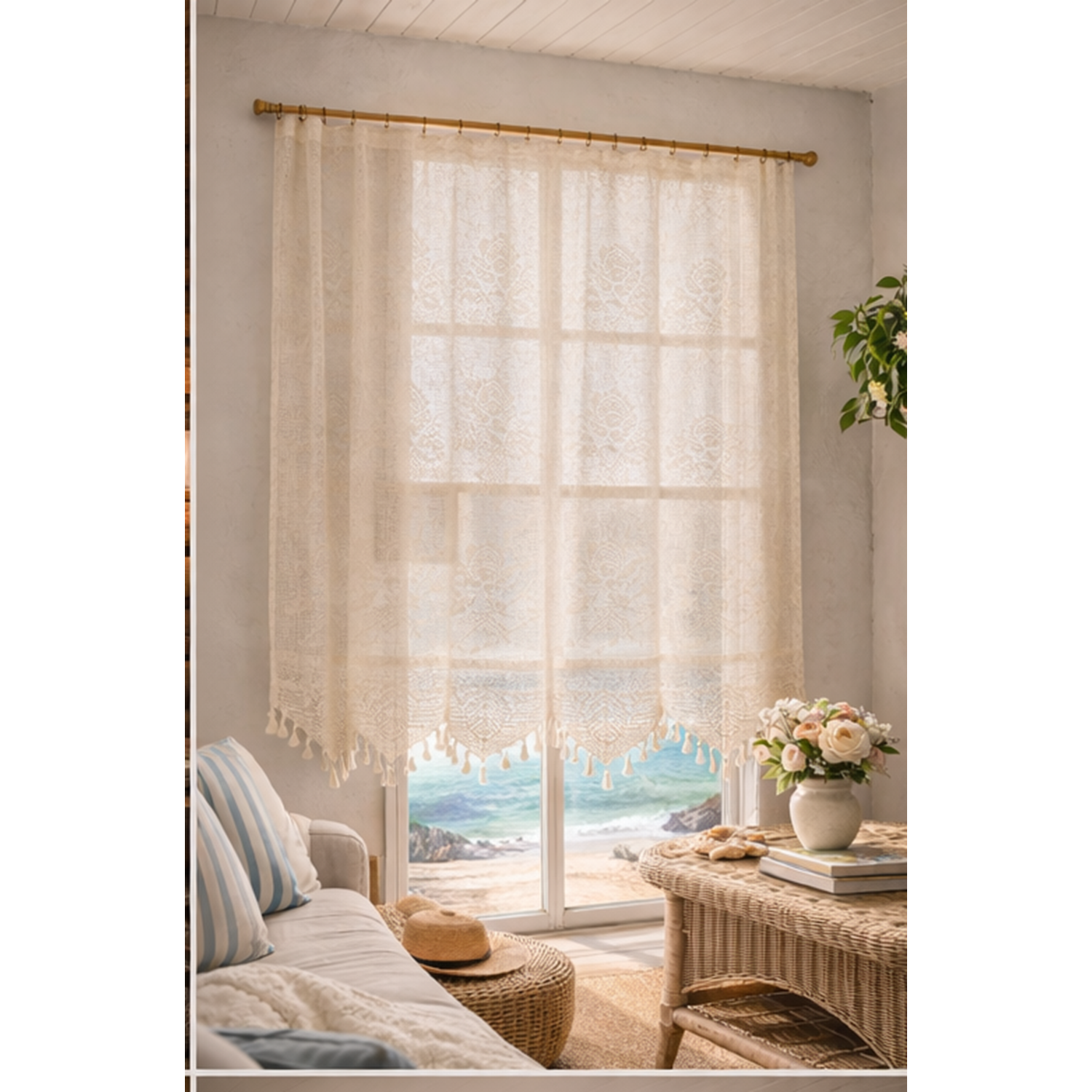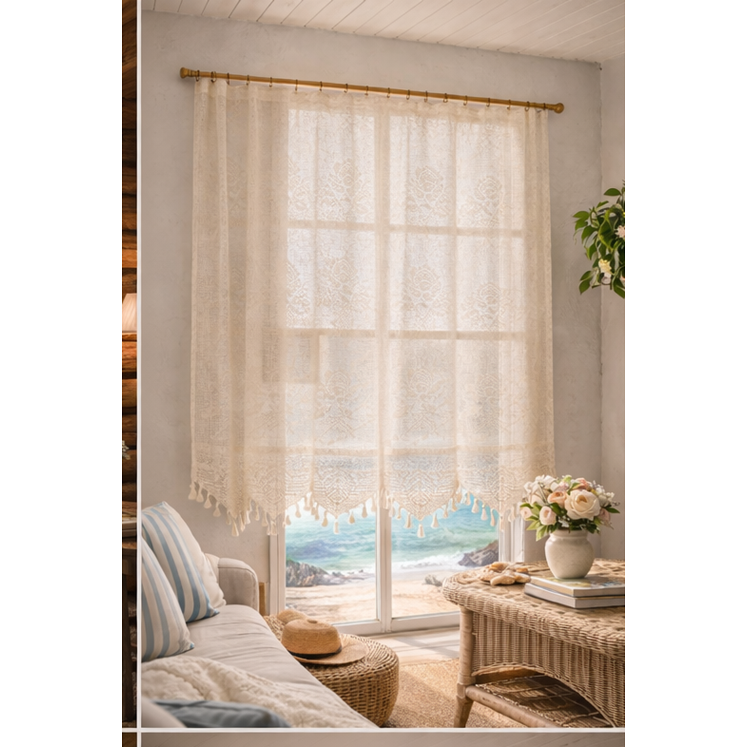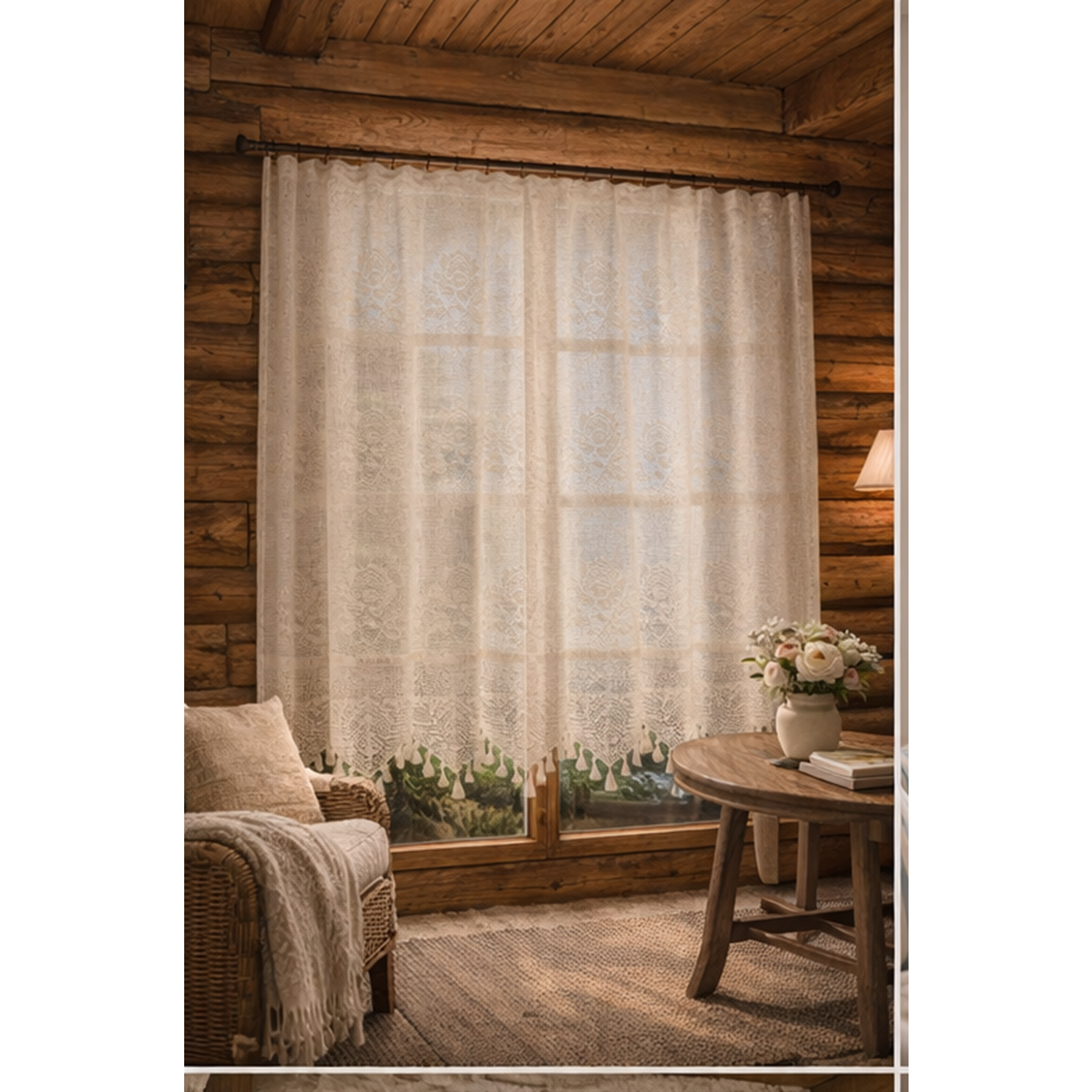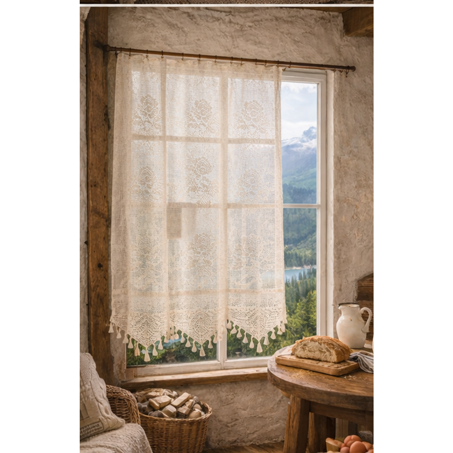 Buldan Tül Perde El İşi Dantelli Gül Desen Rustikli TEK Parcalı (350x160)